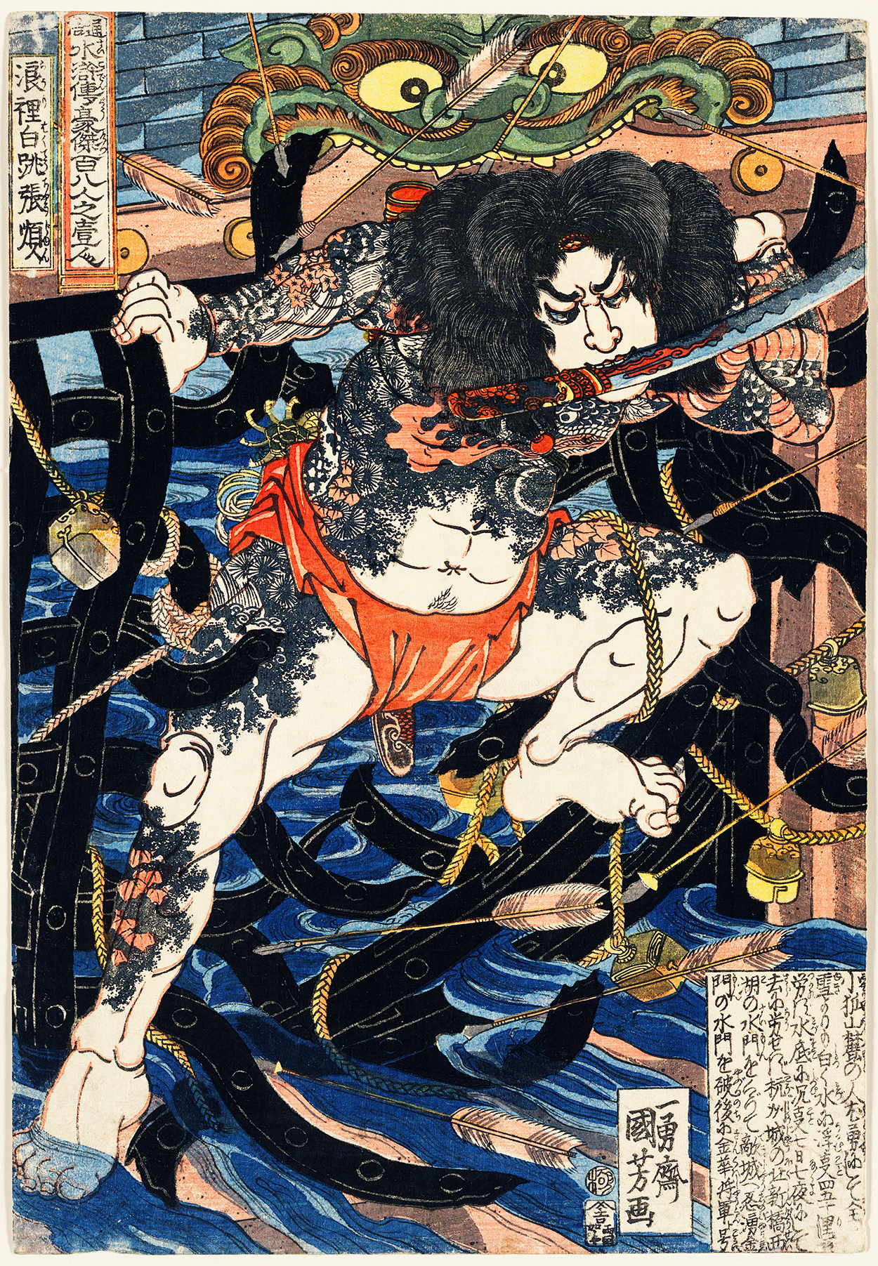 The illustration below is a famous design created by Japanese woodblock artist Utagawa Kuniyoshi (1753–1806). The engraving depicts the legendary warrior Rori Hakucho Chojun crashing through a water gate, bearing his sword in his teeth while arrows rain down around him.