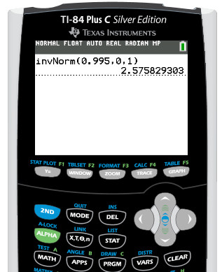 Let's go ahead and do inverse norm again on our calculator. But we can't put in 0.005, because remember, our distribution reads from 0% to 100%. We actually have to do 100% minus 0.05%, or 99.5%. We are going to put in 0.995 and get a positive 2.576.