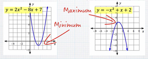 Every parabola has either a low point or a high point on the graph called the vertex. In the graph below, the parabola has a low, or minimum, point. The minimum point has the lowest y-value on the parabola. The second parabola below has a high, or maximum, point, which has the highest y-value on the parabola.