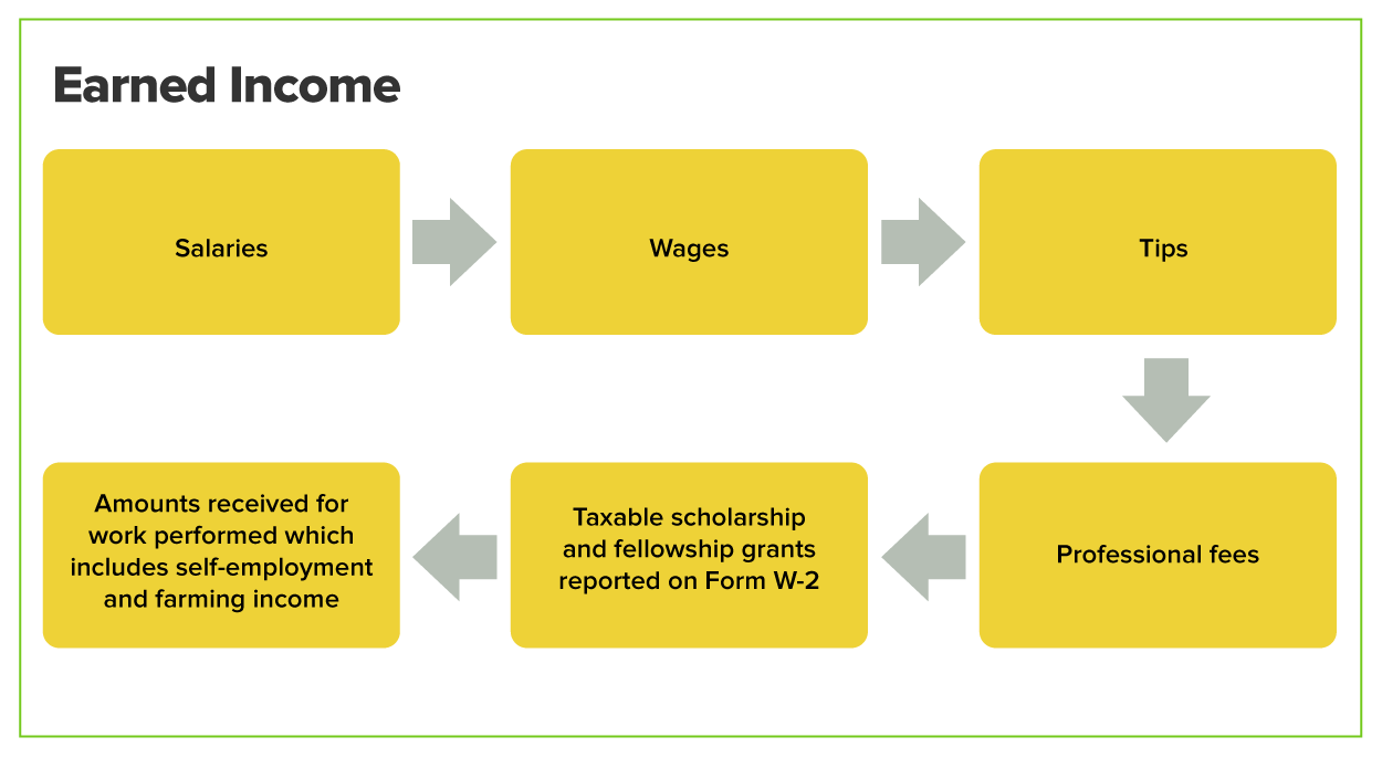 Earned income is received for services performed. Some examples are wages, salaries, commissions, tips, and generally farming and other business income.