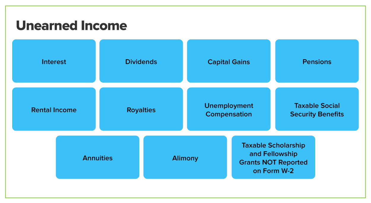 Unearned income is taxable income that does not meet the definition of earned income. It includes money received for the investment of money or other property, such as interest, dividends, capital gains, rents, and royalties. (This is often referred to as “investment income.”)