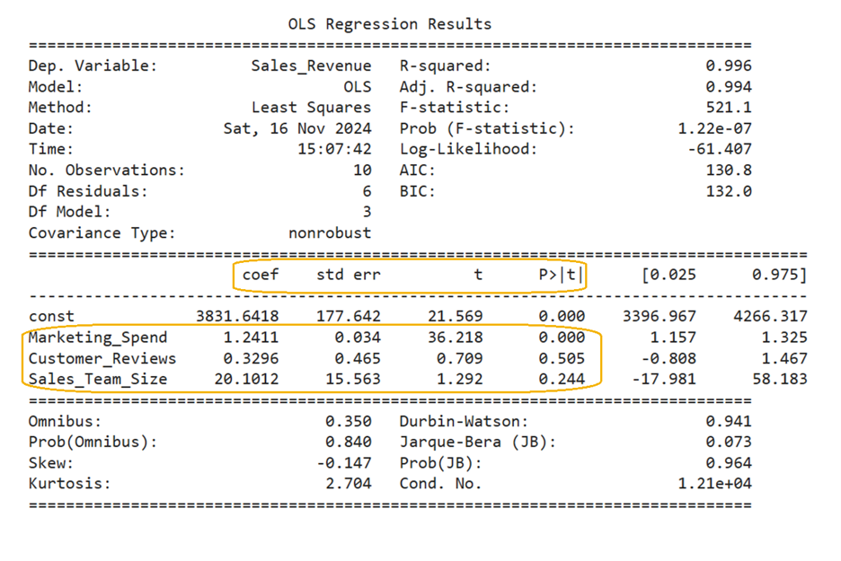 The summary of the regression model is provided below. Using the information highlighted in the orange, a hypothesis test will be conducted for each of the explanatory variables. A description of each of the columns in the highlighted output is provided below: