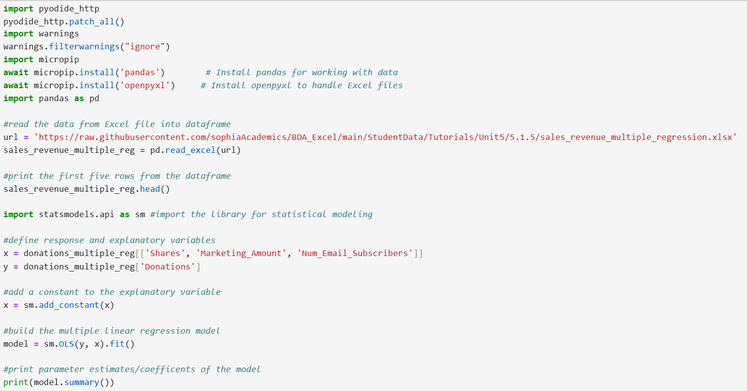 In this lesson, you have learned to differentiate between estimated and true regression models, and how to perform statistical inference to assess the significance of explanatory variables. Returning to the donation prediction example, you interpreted the hypothesis testing results for the multiple regression model to see how each explanatory variable impacts the amount of donations received. Further, by examining and interpreting the standard errors from the multiple linear regression model, you were able to assess the precision of the estimated coefficients, which enhances your ability to interpret the results of the hypothesis tests. The standard errors provide you with deeper insight into the variability and reliability of the estimated regression coefficients, allowing you to better understand the significance and impact of each explanatory variable in your model. With these skills, you are now equipped to critically analyze and interpret linear regression models effectively.