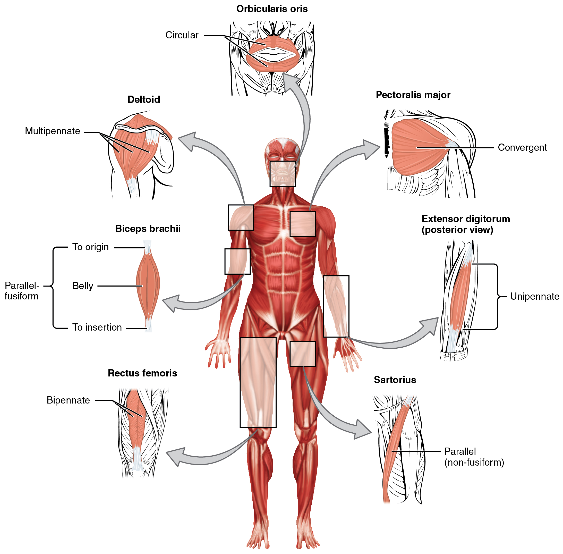 As you have learned, skeletal muscle is enclosed in connective tissue scaffolding at three levels. Each muscle fiber (cell) is covered by endomysium, and the entire muscle is covered by epimysium. When a group of muscle fibers is “bundled” as a unit within the whole muscle by an additional covering of a connective tissue called perimysium, that bundled group of muscle fibers is called a fascicle. Fascicle arrangement by perimysia is correlated to the force generated by a muscle; it also affects the range of motion of the muscle. Based on the patterns of fascicle arrangement, skeletal muscles can be classified in several ways. What follows are the most common fascicle arrangements.