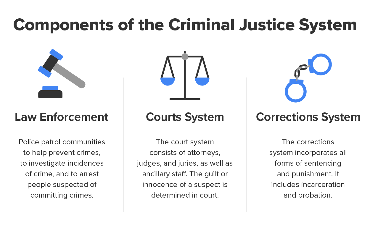 Throughout this course, we will be discussing the criminal justice system and how it works to ensure our safety and protect our civil liberties. The criminal justice system is broken down into three main components: