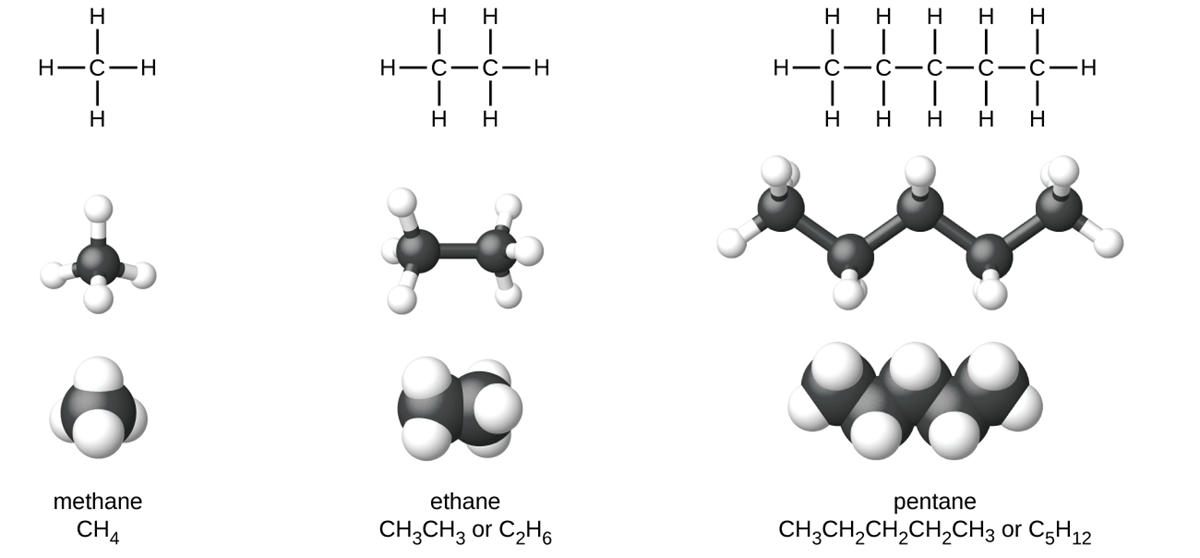 The Lewis structures and models of methane, ethane, and pentane are shown below.