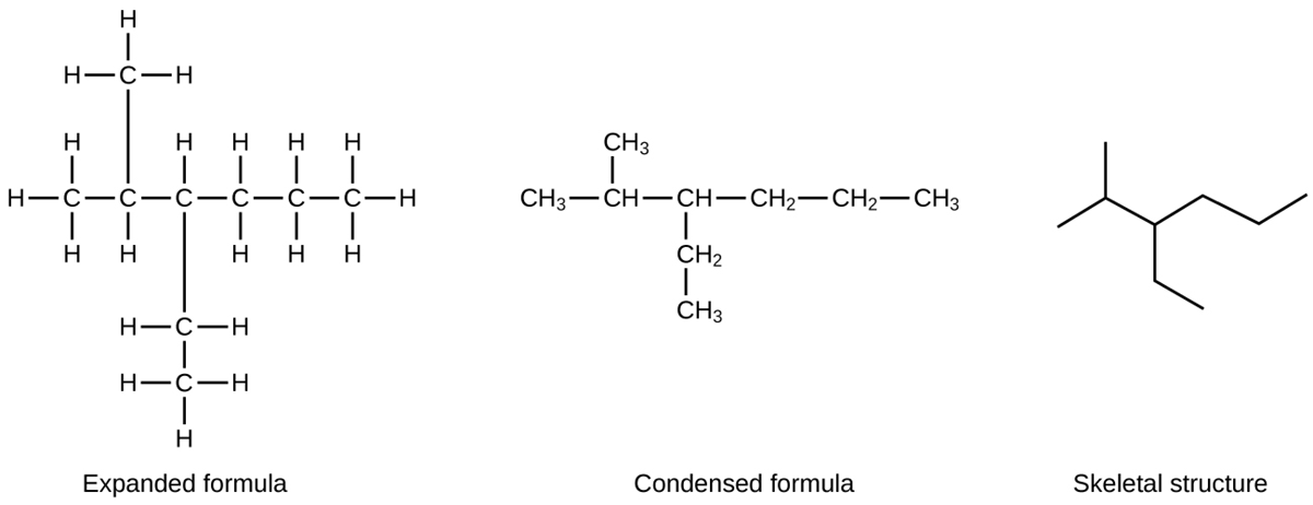 The structures of alkanes and other organic molecules may also be represented in a less detailed manner by condensed structural formulas (or simply, condensed formulas). Instead of the usual format for chemical formulas in which each element symbol appears just once (C