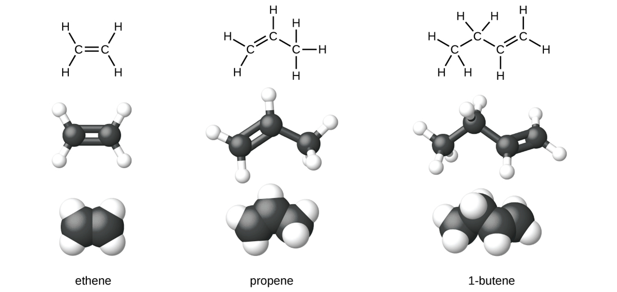 , is the simplest alkene. Each carbon atom in ethene, commonly called ethylene, has a trigonal planar structure. The second member of the series is propene (propylene) and the fourth is butene.