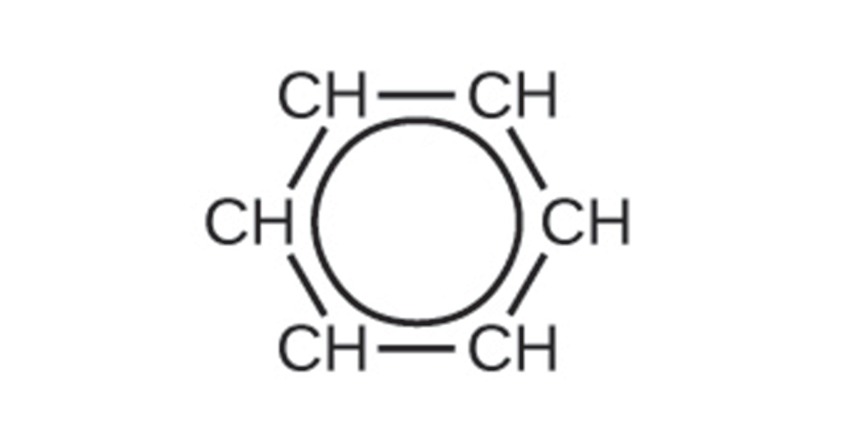 To represent this unique bonding, structural formulas for benzene and its derivatives are typically drawn with single bonds between the carbon atoms and a circle within the ring as shown below: