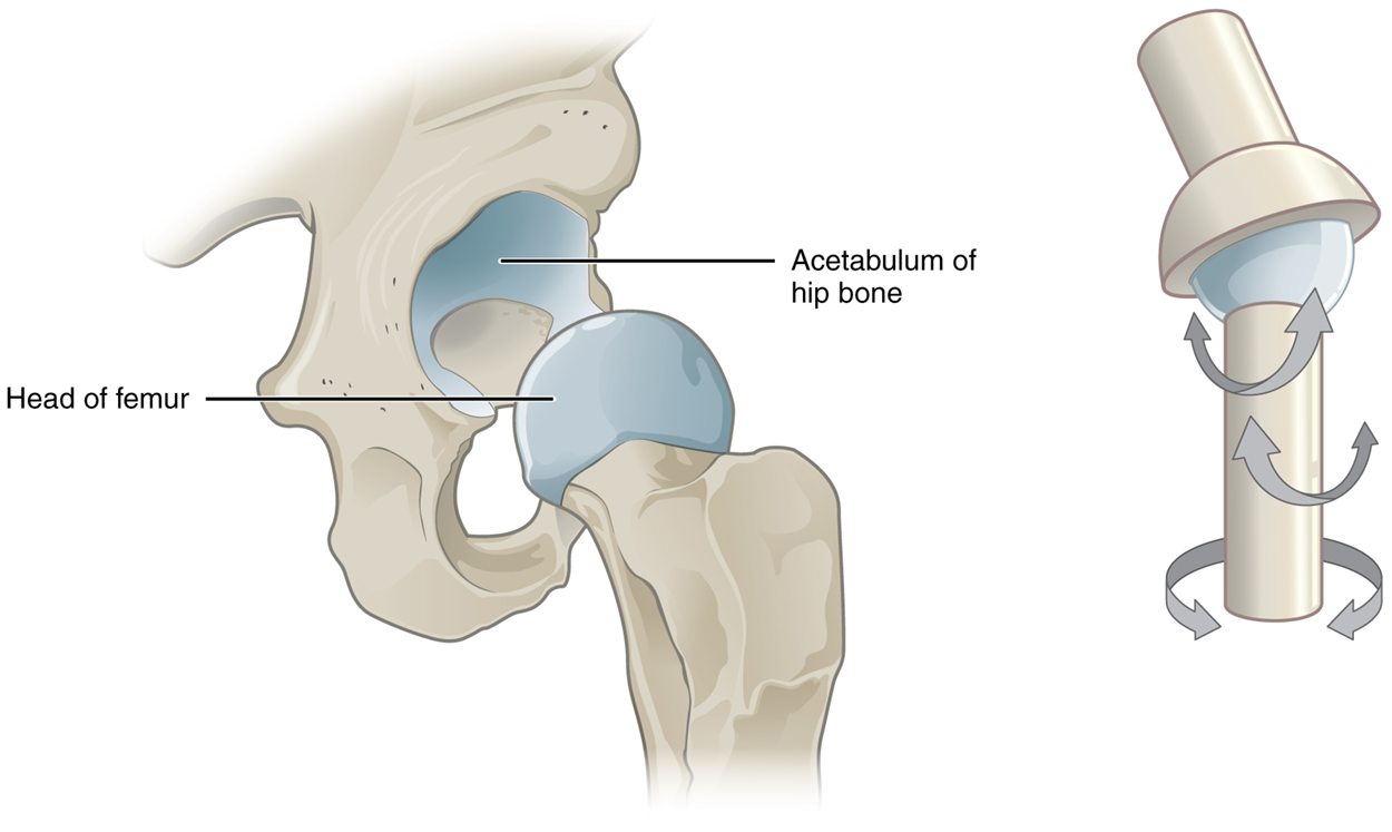 The joint with the greatest range of motion is the ball-and-socket joint. At these joints, the rounded head of one bone (the ball) fits into the concave articulation (the socket) of the adjacent bone. The hip joint and the glenohumeral (shoulder) joint are the only ball-and-socket joints of the body. Ball-and-socket joints are functionally classified as multiaxial joints.