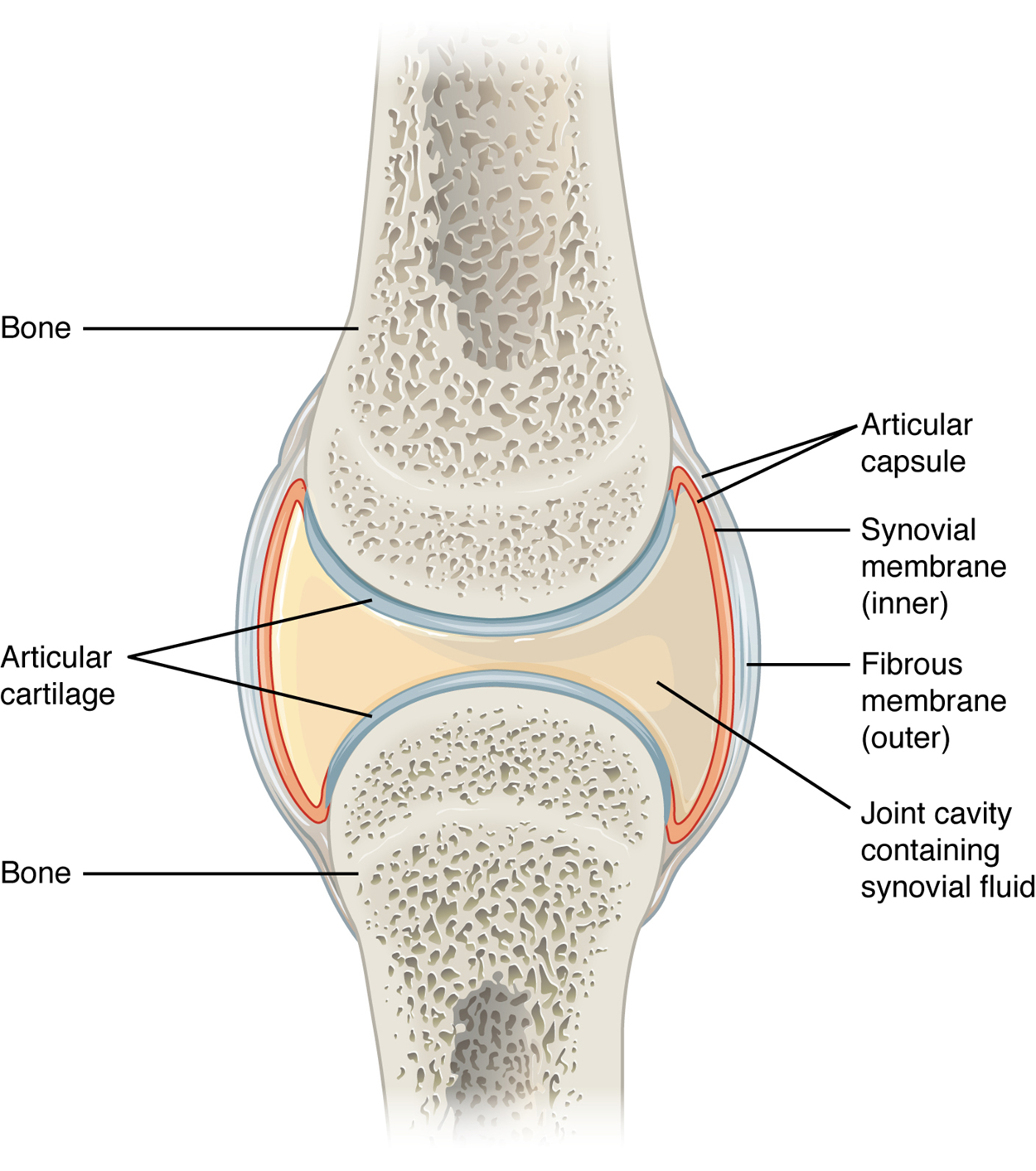Synovial joints are the most common type of joint in the body. A key structural characteristic of a synovial joint that is not seen at fibrous, cartilaginous, or bony joints is the presence of a joint cavity. This fluid-filled space is the site at which the articulating surfaces of the bones contact each other. Also, unlike fibrous, cartilaginous, or bony joints, the articulating bone surfaces at a synovial joint are not directly connected to each other with fibrous connective tissue, cartilage, or bone tissue. This gives the bones of a synovial joint the ability to move smoothly against each other, allowing for increased joint mobility.