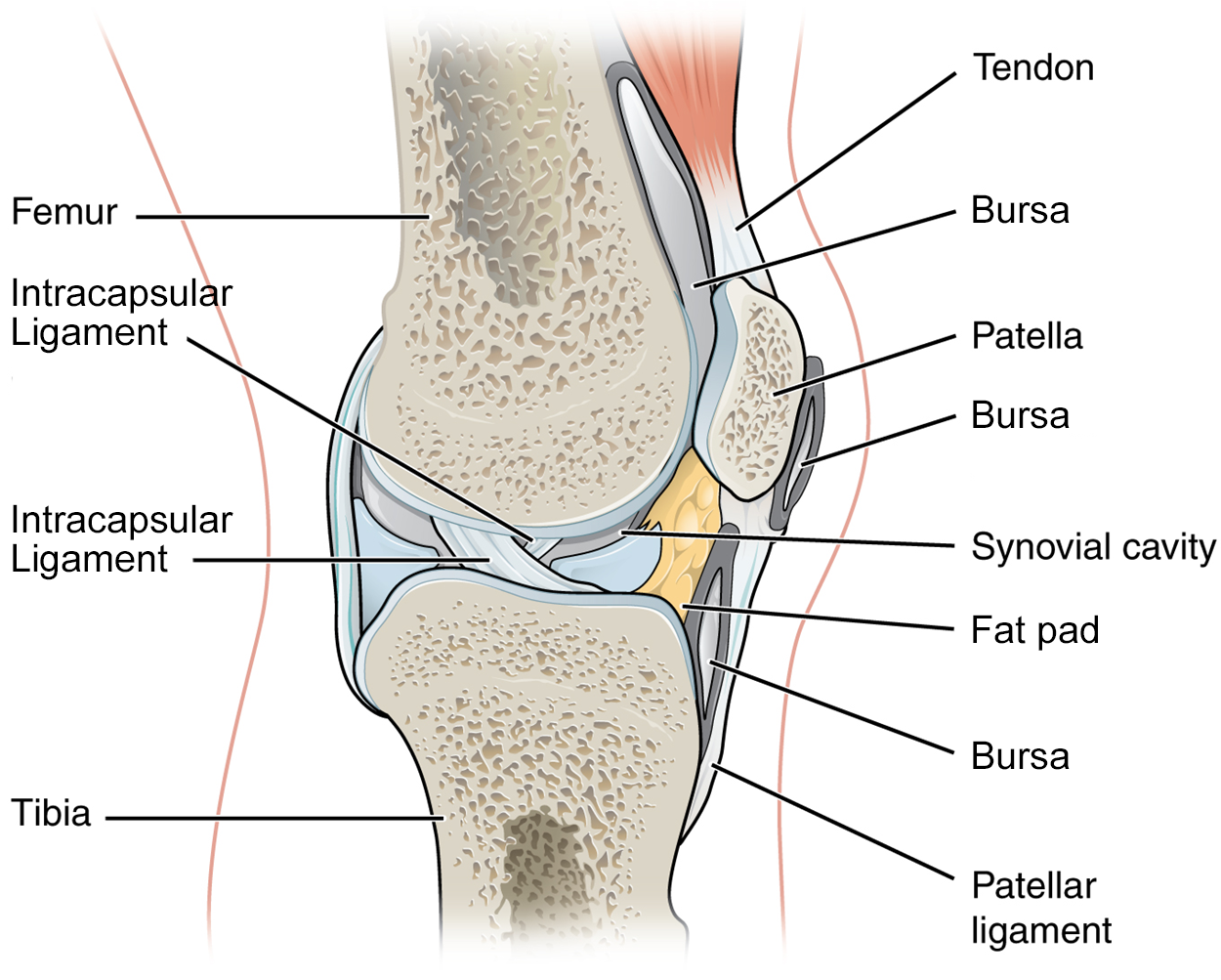 Bursae—Bursae are fluid-filled sacs that serve to prevent friction between skin, muscle, or tendon with an underlying bone. Three major bursae and a fat pad are part of the complex joint that unites the femur and tibia of the leg.