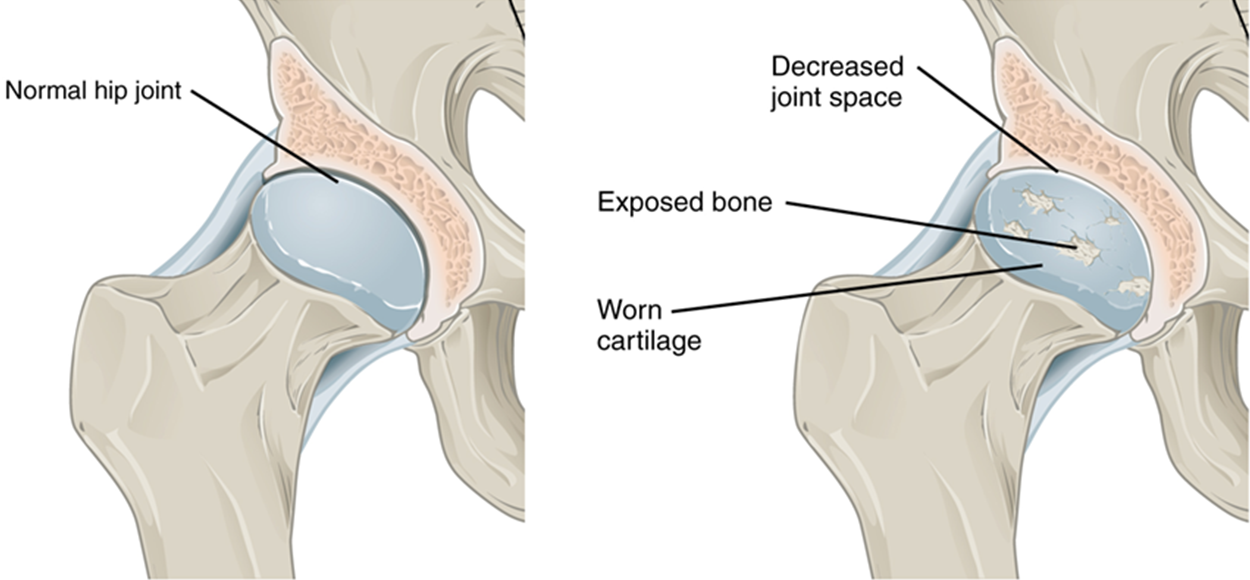 Osteoarthritis—Osteoarthritis of a synovial joint results from aging or prolonged joint wear and tear. These cause erosion and loss of the articular cartilage covering the surfaces of the bones, resulting in inflammation that causes joint stiffness and pain.