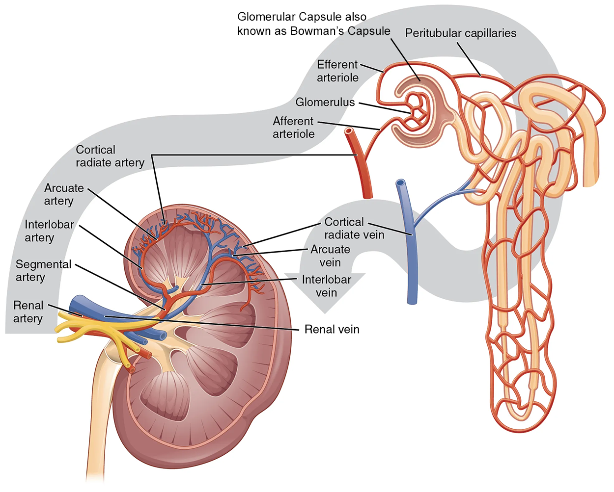 The renal artery first divides into segmental arteries, followed by further branching to form interlobar arteries that pass through the renal columns to reach the cortex. The interlobar arteries, in turn, branch into arcuate arteries, cortical radiate arteries, and then into afferent arterioles, which supply blood to the nephrons. The afferent arterioles service approximately 1.3 million nephrons in each kidney.