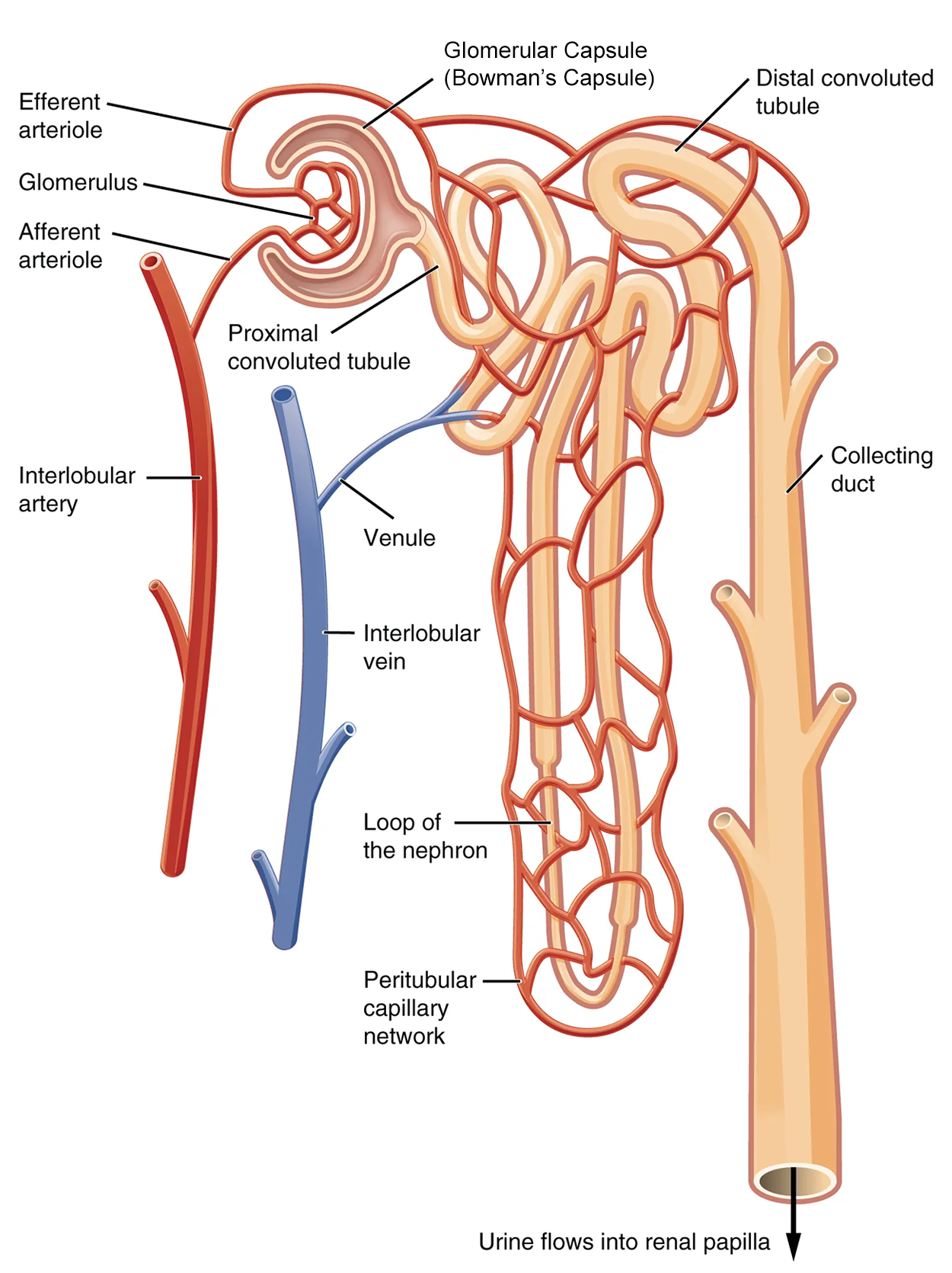 These glomerular capillaries filter the blood based on particle size. After passing through the renal corpuscle, the capillaries form a second arteriole, the efferent arteriole. These will next form a capillary network around the more distal portions of the nephron tubule, the peritubular capillaries and vasa recta, before returning to the venous system.