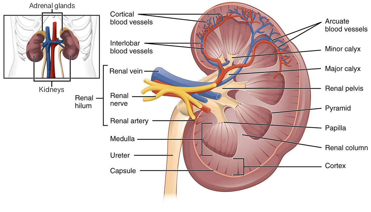 The kidneys regulate the composition and volume of bodily fluids by filtering waste and excess water from the blood. This process starts when blood enters either kidney through the renal arteries (“renal” means having to do with the kidneys). It then passes through microscopic tubes called nephrons, which do the actual filtering. From there, the filtered blood leaves the kidney through the renal veins. The waste and excess water removed by the nephrons become urine, which flows through the renal pelvis out of the kidney and into the ureter.