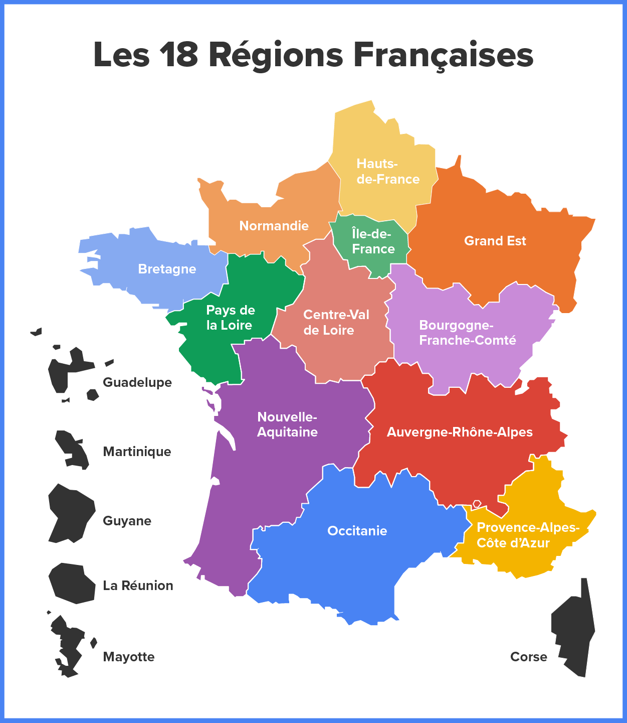 Les régions (regions) are another way France is divided for administrative purposes, and their creation took place in the 1950s to replace former provinces and regions. While there were more than 30 provinces originally, several of them were combined in 2016, and that larger number was reduced to 18 regions. Of these 18 regions, 13 are in Metropolitan France. The remaining five are overseas, and we will focus on those in our lesson La culture: Overseas France in the next unit.