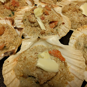 Les coquilles Saint-Jacques (sea scallops), native to the Normandy shores and typically eaten as an appetizer baked in their shells in a cream sauce, often covered with breadcrumbs |