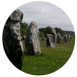 Les menhirs de Carnac are tall, man-made stones that were placed in fields as single standing stones during the Bronze Age. Menhirs were made famous by the comic strip Astérix, in which the character Obélix likes to carry a menhir on his back.