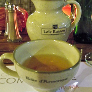 It is customary to drink du cidre, hard apple cider, during your meal, served in une bolée (a bowl made with sandstone). |