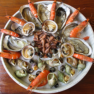 One of the most traditional dishes is le plateau de fruits de mer (seafood platter), where you can find des huîtres (raw oysters) and other shellfish (served either raw or cooked), along with several types of shrimp. |