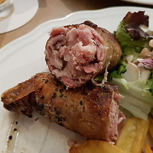 La ficelle picarde, a crepe stuffed with ham, mushrooms, and shallots in a cream and white wine sauce, then covered with cheese and oven-grilled |