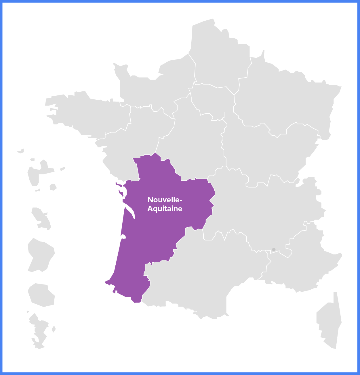La Nouvelle-Aquitaine is France’s largest region, with a long shore along the Atlantic coast. It shares a border with Spain on its southern side. Its climate of mild winters and warm summers contributes to the region’s agricultural richness, where many fruits and vegetables are grown. There are also many vineyards, and it is a very attractive region for tourists. While the region features many forests, a number of them have been heavily damaged by wildfires in recent years.