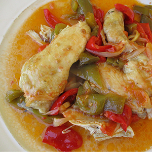 Le poulet basquaise is a chicken dish from the Basque area that is cooked with peppers, tomatoes, onions, garlic, olive oil, and white wine. |