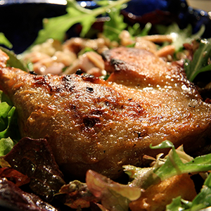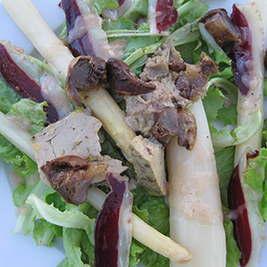La salade landaise features a bed of lettuce and other vegetables, topped with du jambon de Bayonne, pieces of magret de canard, and sometimes du foie gras. |
