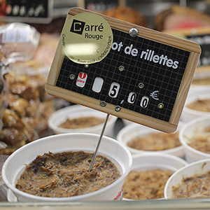 Les rillettes, a meat delicacy (often pork) cooked for a long time in its own fat, and then shredded and seasoned, most often eaten on bread |