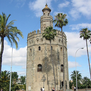Torre del Oro (Tower of Gold). It was built as a watchtower by the Moors in the 13th century. It used to shimmer as the sunlight danced across its original gold tiles. After serving as a watchtower, it became a gold warehouse, a Christian temple, the Headquarters of the Admiralty, and now serves as the