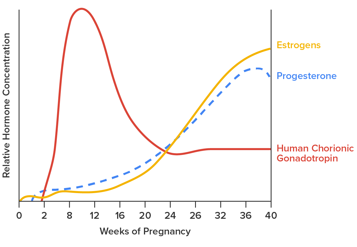 First, recall that progesterone inhibits uterine contractions throughout the first several months of pregnancy. As the pregnancy enters its seventh month, progesterone levels plateau and then drop. Estrogen levels, however, continue to rise in the maternal circulation. The increasing ratio of estrogen to progesterone makes the myometrium (the uterine smooth muscle) more sensitive to stimuli that promote contractions (because progesterone no longer inhibits them). Moreover, in the eighth month of pregnancy, fetal cortisol rises, which boosts estrogen secretion by the placenta and further overpowers the uterine-calming effects of progesterone. Some people may feel the result of the decreasing levels of progesterone in late pregnancy as weak and irregular peristaltic Braxton Hicks contractions, also called false labor. These contractions can often be relieved with rest or hydration.