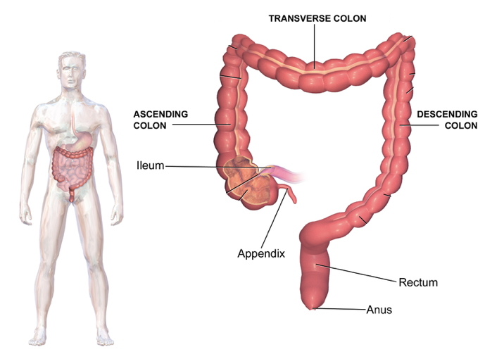 The large intestine is broken down into two sections, the colon, and the rectum.