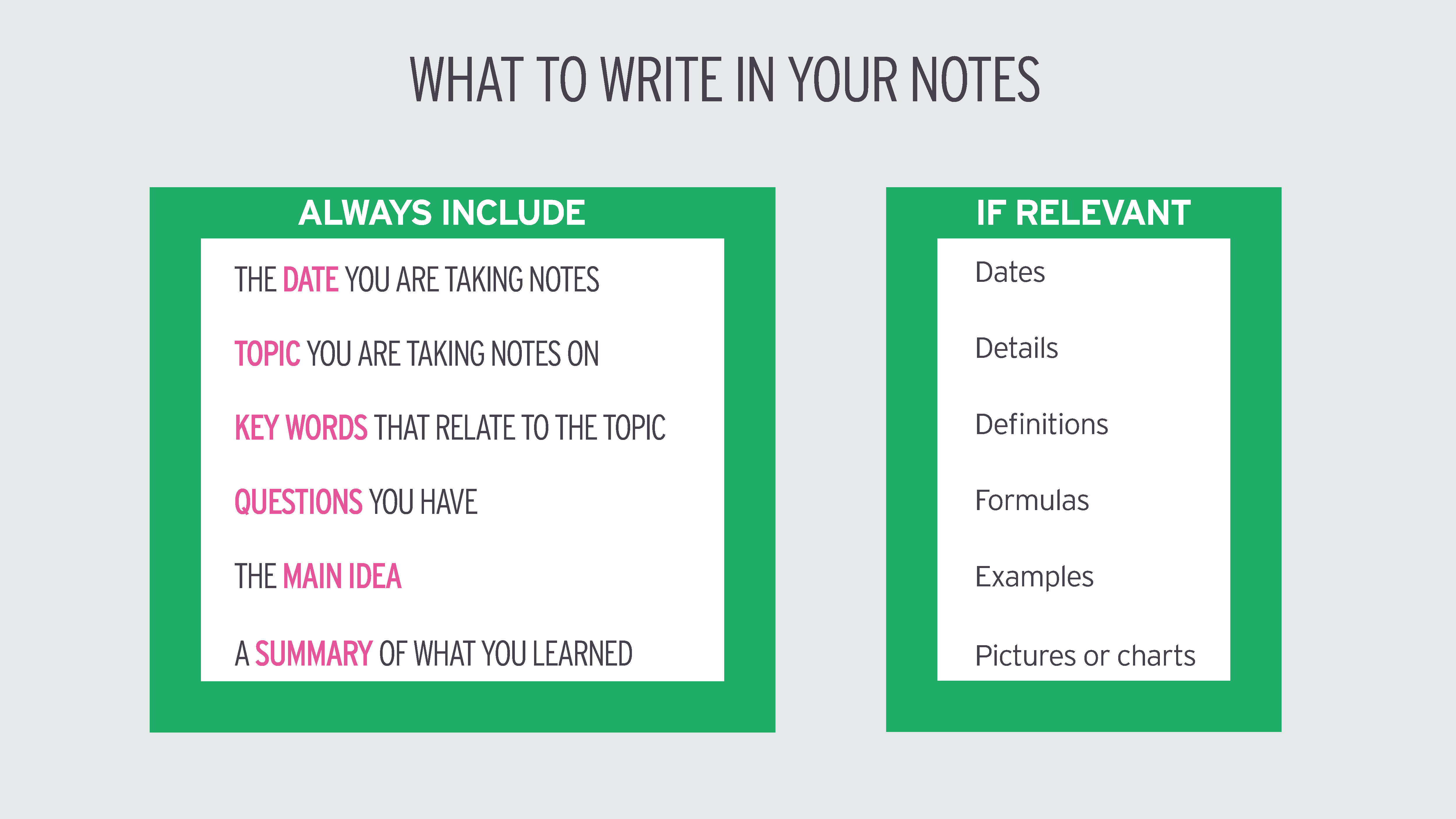 At a minimum, your notes should include: