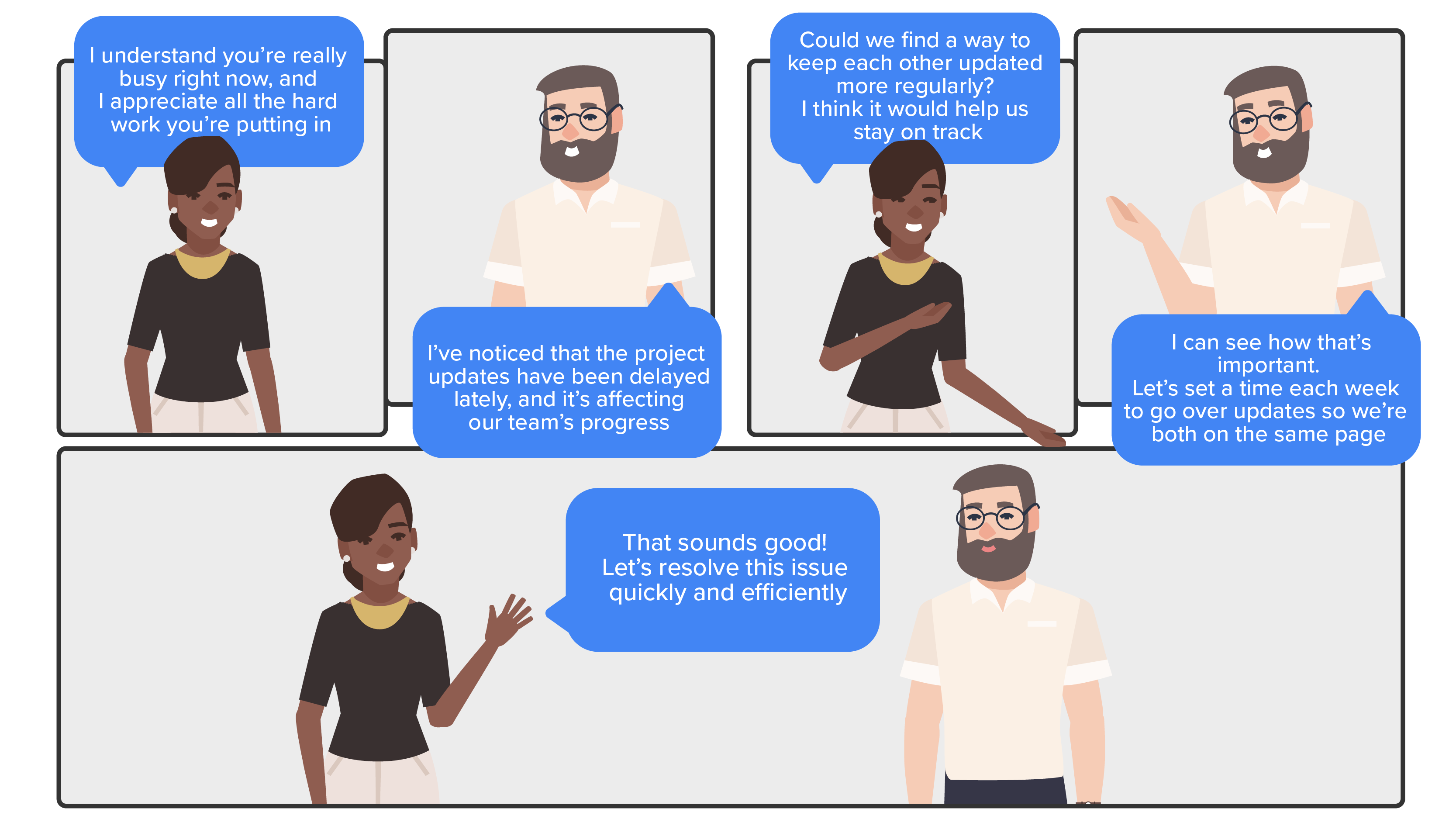 Saying, “I understand you’re feeling overwhelmed with your workload,” demonstrates that you’re aware of their situation before you introduce your own concern.EXAMPLE