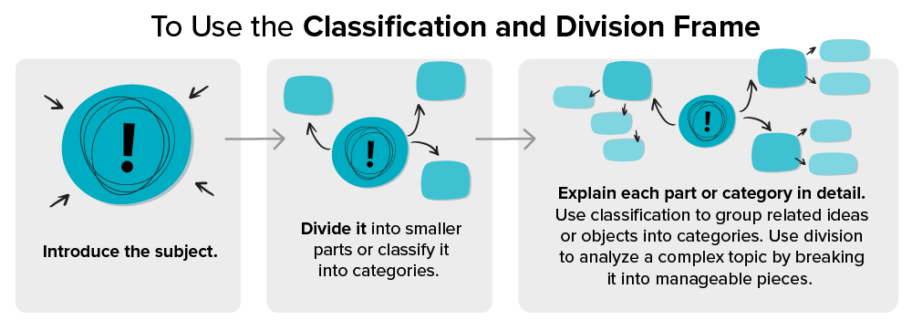 The classification-and-division approach involves breaking a subject into smaller parts (division) or grouping similar elements together (classification) to make it easier to understand. Select the expandables below to see some examples.