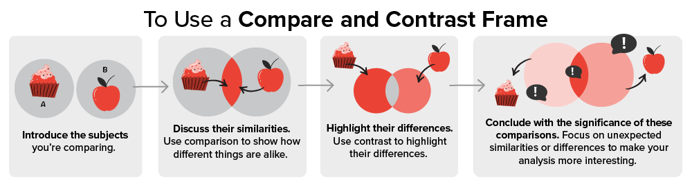 - Identify two subjects and address their similarities and then their differences: One way in which (subject 1) ___________ and (subject 2) ___________ are alike is (similarity) ___________; one way in which they differ is (difference) ___________.