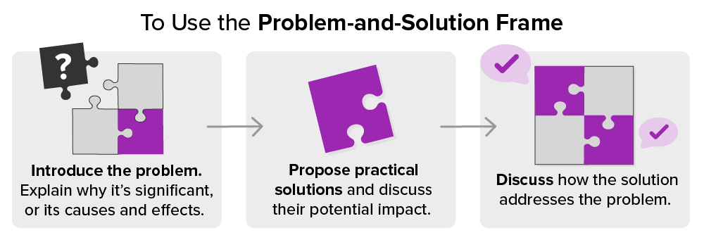 The problem-and-solution strategy identifies a problem and proposes one or more solutions to address it. Most problem-and-solution paragraphs begin with the problem, but if the solution is unique enough, you might begin with the solution. Select the expandables below to see some examples.
