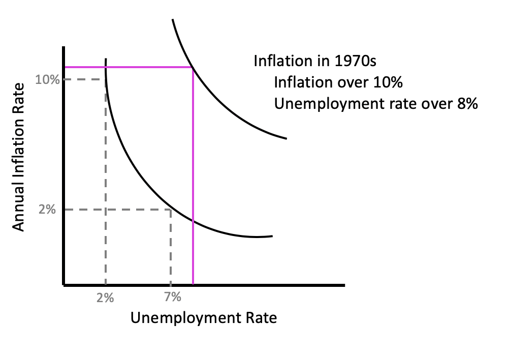 We would not be able to explain this with the simplified model above, because there were times in the 1970s when inflation was well over 10% coupled with an unemployment rate over 8%.