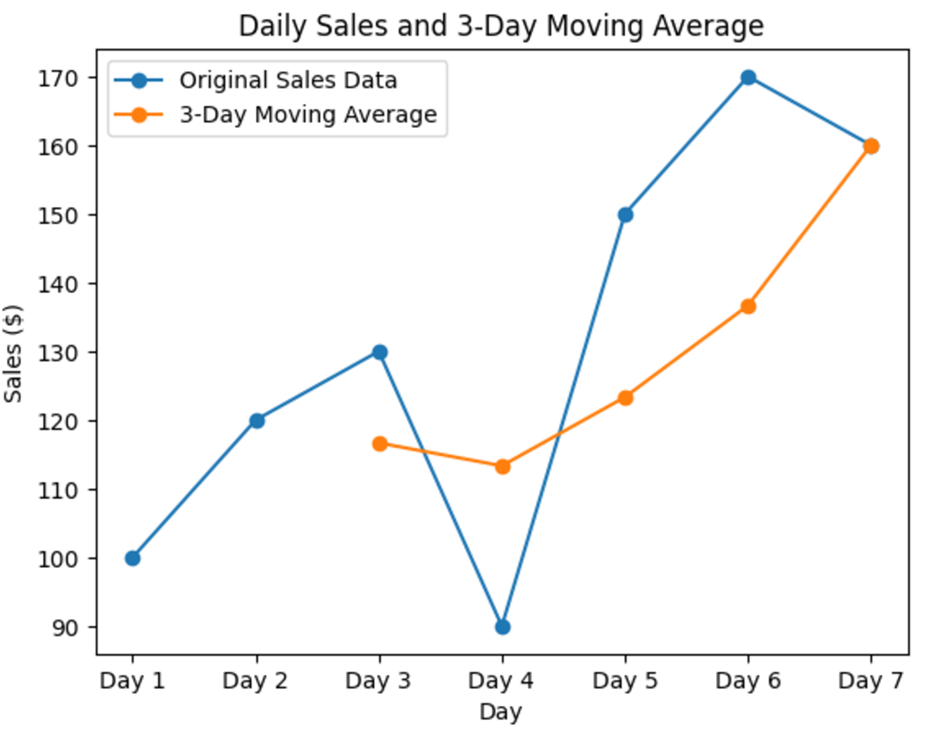 Visualizing the original time series data along with the forecasts can help you understand how moving averages smooth out fluctuations. Below is a plot showing the original sales data and the 3-day moving average forecasts. As you can see, the moving average line is smoother than the original sales data line. This smoothing effect helps to highlight the overall trend by reducing the impact of short-term fluctuations.
