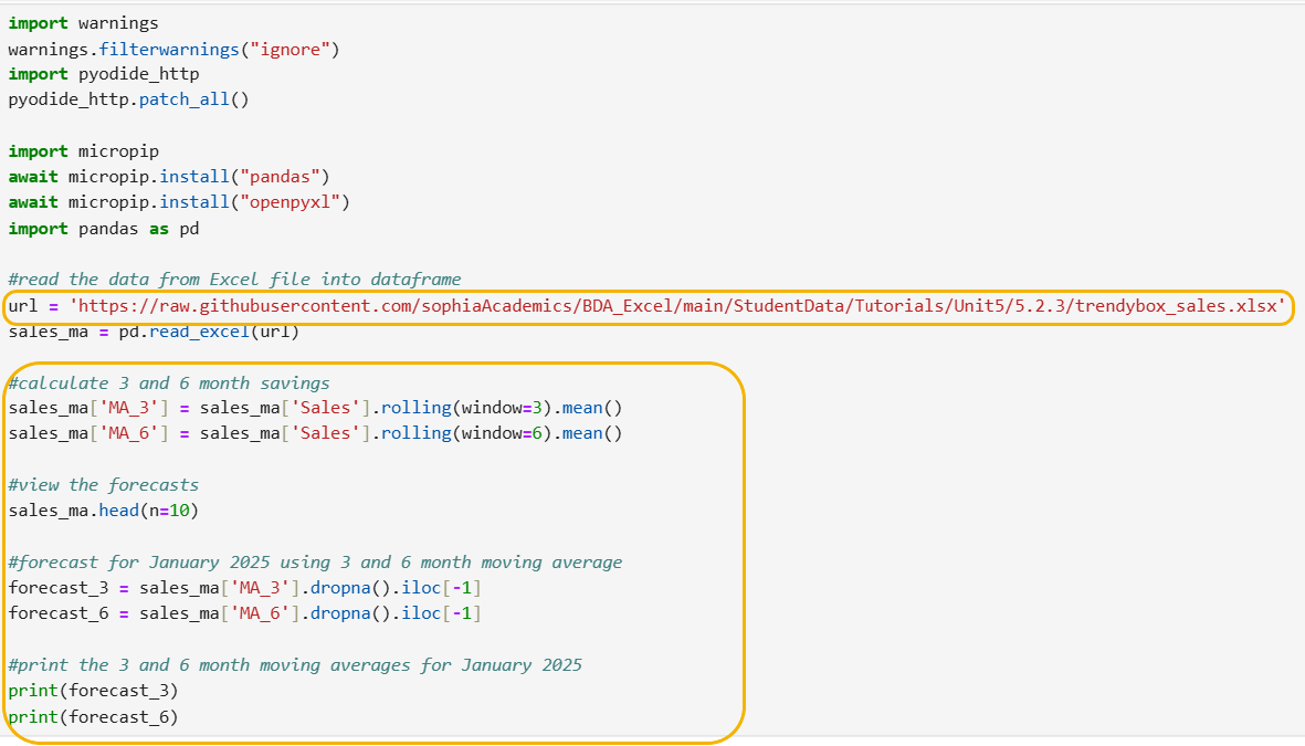 The code below imports pandas, imports an Excel file from a URL, and creates a pandas DataFrame named sales_ma before continuing to calculate moving averages.