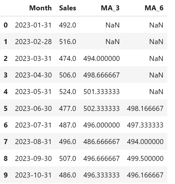 The Sales column contains the actual value of the sales for each month and the columns MA_3 and MA_6 contain the forecasted values for the 3- and 6-month moving averages, respectively.