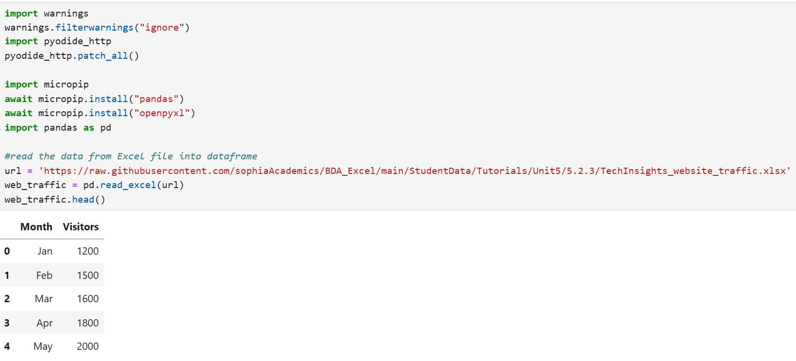 - Import the Excel file, create a pandas DataFrame named web_traffic_ma, and view the first five rows of the data frame.