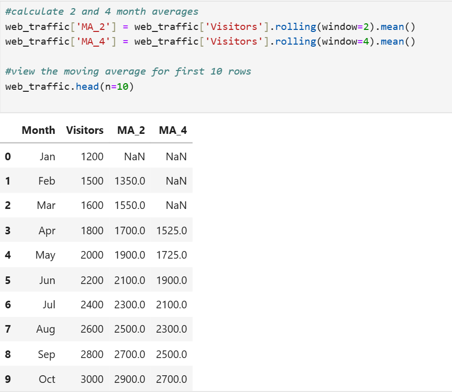 - The 2-month moving average (MA_2) has a NaN (missing) value for January, because there is no previous month to average with.