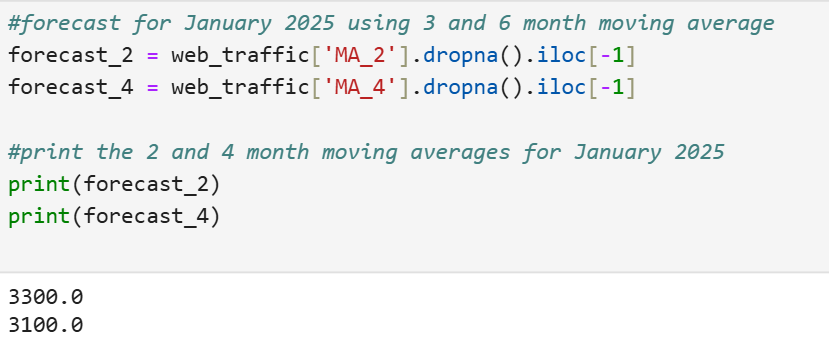 This code snippet below first drops any NaN (missing) values from the moving average columns to ensure only valid data points are used. Then, it selects the last available value from each moving average column (MA_2 and MA_4) to use as the forecast for January 2025. Finally, it prints the forecasts for both the 2-month and 4-month moving averages.
