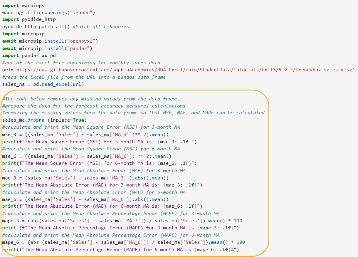 - These lines calculate the MAE for the 3- and 6-month moving average by taking the absolute value of the errors (differences between actual sales and the 3- and 6-month moving averages, which contain the forecasted values), calculating the mean of these absolute errors, and printing the result.