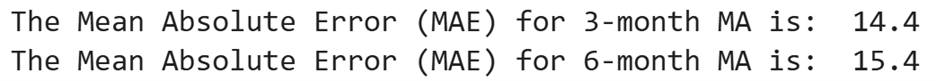 The output tells you that the 3-month moving average provides a slightly more accurate forecast than the 6-month moving average. This is indicated by the lower Mean Absolute Error (MAE) value for the 3-month moving average (14.4) compared to the 6-month moving average (15.4).