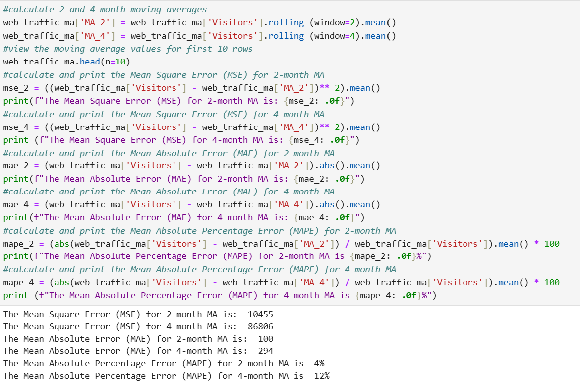 You are a data analyst at TechInsights, a tech blog that provides insights and updates on the latest technology trends. In a previous exercise, you forecasted the number of website visitors for January 2025 using 2- and 4-month moving averages. You will need to return to that code. You are going to assess which moving average is the most accurate. You are going to calculate three forecast accuracy measures, MSE, MAE, and MAPE, for the 2- and 4-month moving averages.