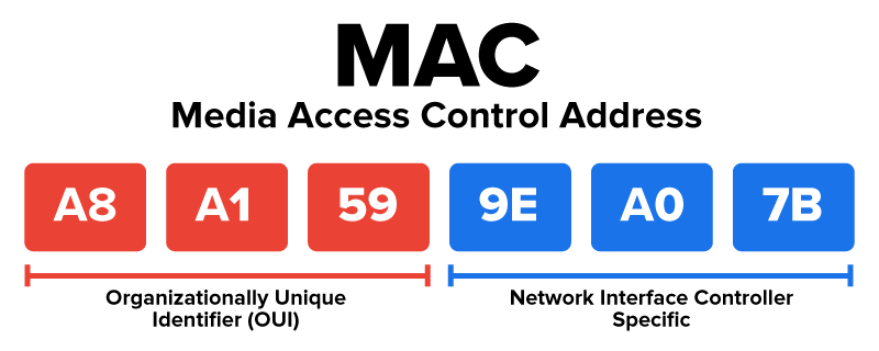 Every device on a network needs a unique identity. A Media Access Control address (MAC address) is a permanent, built-in code assigned to the NIC by the manufacturer. It acts like a local ID tag for your device on the network. MAC addresses are made up of 12 characters, usually written as six pairs separated by colons, for example, A8:A1:59:9E:A0:7B.