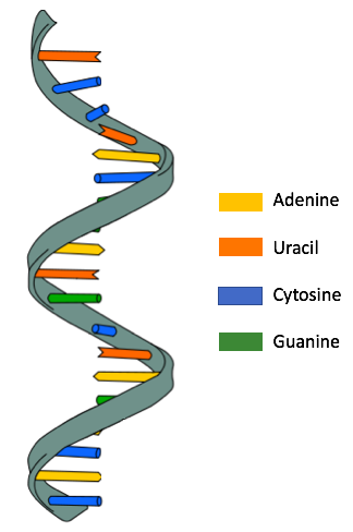 In double-stranded nucleic acids, bases of opposite strands project toward each other and associate using hydrogen bonds. Adenine bonds with thymine in DNA (or uracil in RNA), and cytosine bonds with guanine. DNA then twists to form a shape known as a double helix, which resembles a spiral staircase.